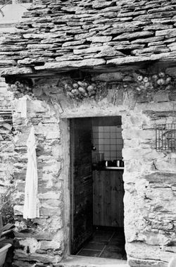 Von links nach rechts: Grossvater Mario (Nonu Mario) mit Sohn Giorgio beim Setzen neuer Reben; der ehemalige Schweinestall des Bauernhofs, der nach dem Umbau zur Küche ausgebaut wurde; ein müdes, aber zufriedenes Team: Mario und Nunzia Rossi mit Sohn Giorgio (ganz rechts) und ihren Helfern bei der Traubenernte; das Wahrzeichen des Tessiner Weinbaus: der Merlot.
